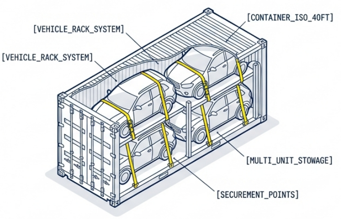 This method allows shippers to safely transport up to four small cars in a single 40-foot container, making it a popular choice for consolidated vehicle shipments.