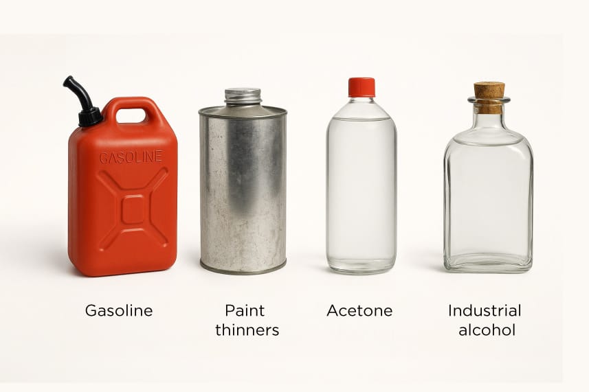 Flammable liquids have low flash points and can easily produce vapors that ignite when exposed to heat or a spark. Cabin and cargo hold temperatures can fluctuate mid-flight, increasing volatility.